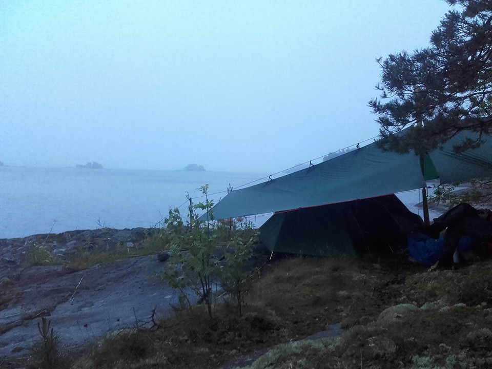 Käytän teltan suojana tarppia aina kun se on mahdollista. Toisinaan yhdistimme kaksi tarppia yhteen, jolloin saimme ison katoksen kahdelle teltalle. Silloin oli tilaa myös tehdä ruuat katoksen alla. Tarpin kiinnitysnarujen kiinnitys puiden ympärille onnistuu näppärästi polkupyörästä tutuilla mustekaloilla. Ne pitävät kankaan myös sopivasti kireällä ja antavat joustoa tuulessa. Eikä puihinkaan jää jälkiä niin helposti kuin narusta. Tarppi on aina pakattuna kajakkiin siten, että sen saa nopeasti esiin. Sen alla on sateella mukavampi nauttia evästä tai koota teltta. Tauollekin mentäessä viritimme tarvittaessa itsellemme katoksen, jos muuta suojaa ei ollut tarjolla. Niin ja ne perinnemelat, jos ei ole puita tarjolla voi meloja käyttää tukena tarpin virityksessä. Kiviä narujen kiinnitykseen luodoilta kyllä löytyi yllin kyllin.