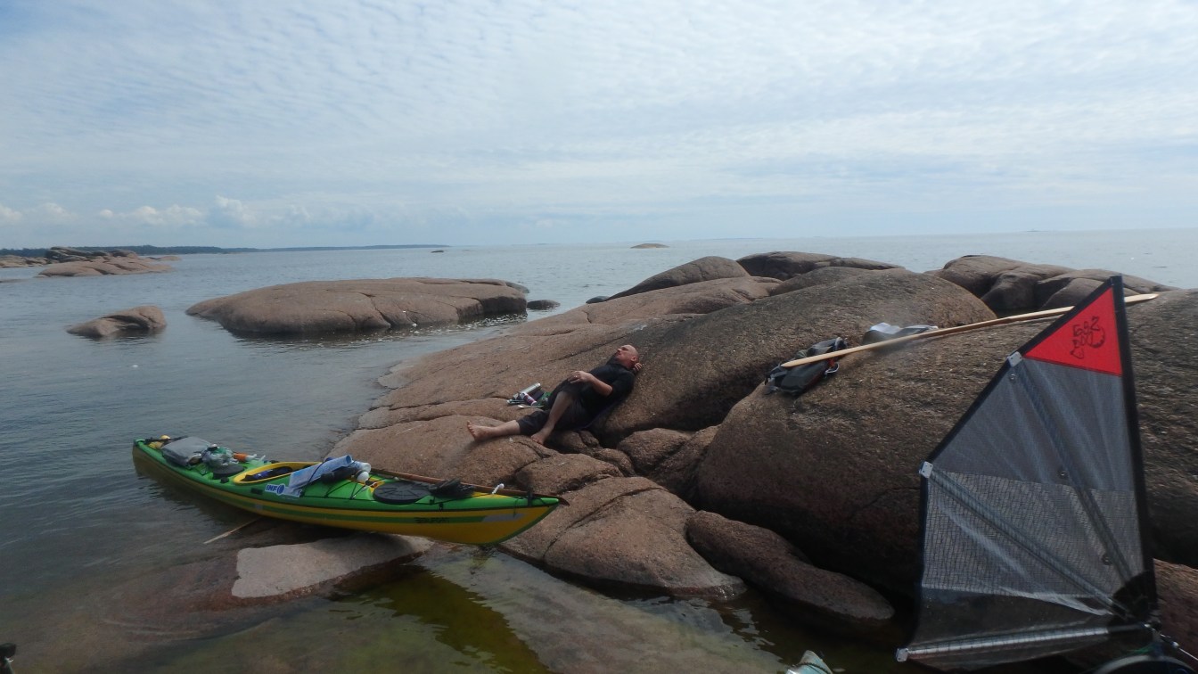 Matkan alussa on niin innostunut, että ei huomaa pieniä kipuja, joita rasituksesta tulee. Kun muutaman päivän jälkeen alkoi tuulla tosissaan vastaan ja aallot lyödä hartioista yli, alkoi huumori olla kaukana. Paikat särkivät rasituksesta, vaikka niitä oli talven aikana siihen valmennettu. Aalto on kuin seinä sen tullessa päin rintaa, vauhti loppuu siihen. Ennen kuin tähän totuin, olin jo yhtenä aamupäivänä melonut itseni aivan piippuun. Lounastauolla nukuin paljaalla kalliolla parin tunnin päiväunet ennen kuin päästiin jatkamaan matkaa. Löysin kuitenkin aika pian oman vauhtini, enkä yrittänyt roikkua Juhon rinnalla. Juholla oli kajakissa purje auttamassa matkantekoa.