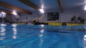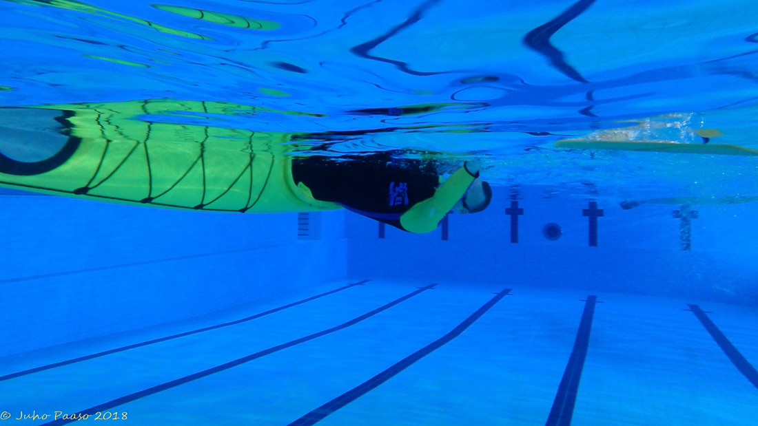 Harjoittelun apuna käytetään kellukkeita melassa ja mikä minun kohdalla oli tehokasta – suoritus tehtiin ns takaperin. Ensin laskeuduttiin selälleen takakannen kautta kajakin viereen kellumaan ja siirryttiin siitä samaa kautta takaisin. Kun se alkoi sujua olikin pian sitten aika siihen että aloitettiin nousu ala-asennosta ylös. Pian sitä mentiin kuin pesukone ympyrää moilemmin puolin.
