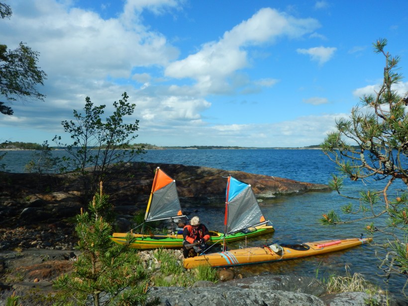 Mukava päivämelonta kevyellä kajakilla. Tuulikin antoi purjeisiin mukavasti potkua, joten työntöapuakin saatiin, kun nyt oltiin se pari kilometriä ensin melottu vastatuuleen.
