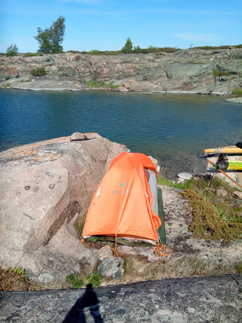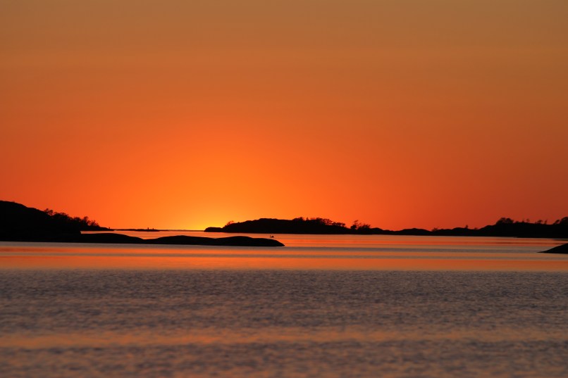 Pujottelimme saarten sokkeloissa kohti Träjukobbenia purjeet pulleina. Kerrankin on oikea tuulensuunta tähän hommaan. Keli alkoi jo hieman hellittää, joten päätimme että pyyhkäistään isosta selästä yli, kun keli sen sallii. Tähän asti purjeet oli olleet reivattuna, mutta keskellä selkää päätettiin ottaa rätit auki ja mennä täysillä neliöillä eteenpäin. Se olikin sitten aikalailla reipasta menoa kunnes tuuli lähes tyyntyi ja piti taas ruveta oikeisiin melonta hommiin. Sundskär tavoitettiin vielä hyvinkin alkuillasta, joten majoittumiseen jäi hyvää aikaa. Edellisenä vuonna olimme samalla saarella ja silloin katsoimme tämän leiripaikan valmiiksi. Käytiin varoiksi kurkkaamassa viereisellä saarellakin, mutta lähellä ollut mökki sai meidät toisiin ajatuksiin. Palasimme tuohon alkuperäiseen paikkaa. Kruununa saimme illalla aivan upean auringonlaskun.