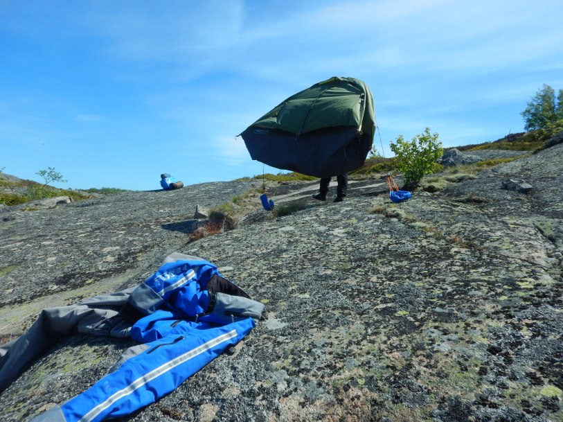 Tuulivaroituksista tiesimme että tulevana yönä tulee olemaan kova myräkkä. Päätimme siirtää teltat suojaisampaan paikkaan. Homma on sikäli helppo, koska tuo teltta mikä meillä on käytössä, on helppo kantaa. Sen kun ottaa vaan harjasta kiinni ja siirtää toiseen paikkaan.