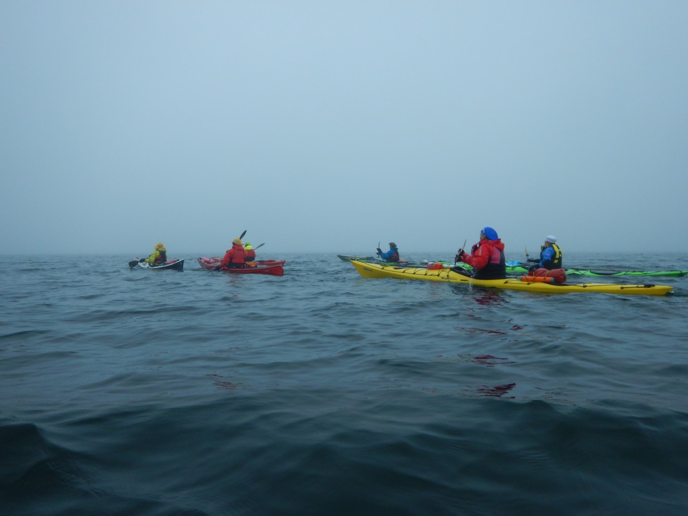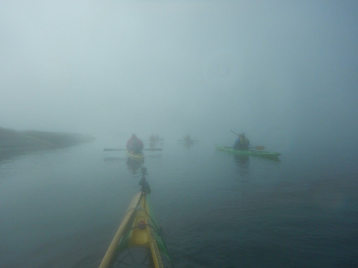 Aamu ei valjennut, oli sen verran tiukka sumu. Heitin rannasta kiven niin kuulin loiskahduksen mutta en nähnyt mihin kivi putosi. Kai se siitä hälvenee edes hieman aamutoimien aikana. Ei hälvennyt. Porukka oli kyllä jo ammattimaisesti menossa merelle, kun olin vielä maissa. Nurkan takana into sitten hieman hiipui, kun etumaiset muutaman kymmenen metrin päässä alkoi hävitä sumuun. Jos sittenkin odotetaan sitä opasta mukaan. Nyt olikin sitten pidettävä porukka nipussa.