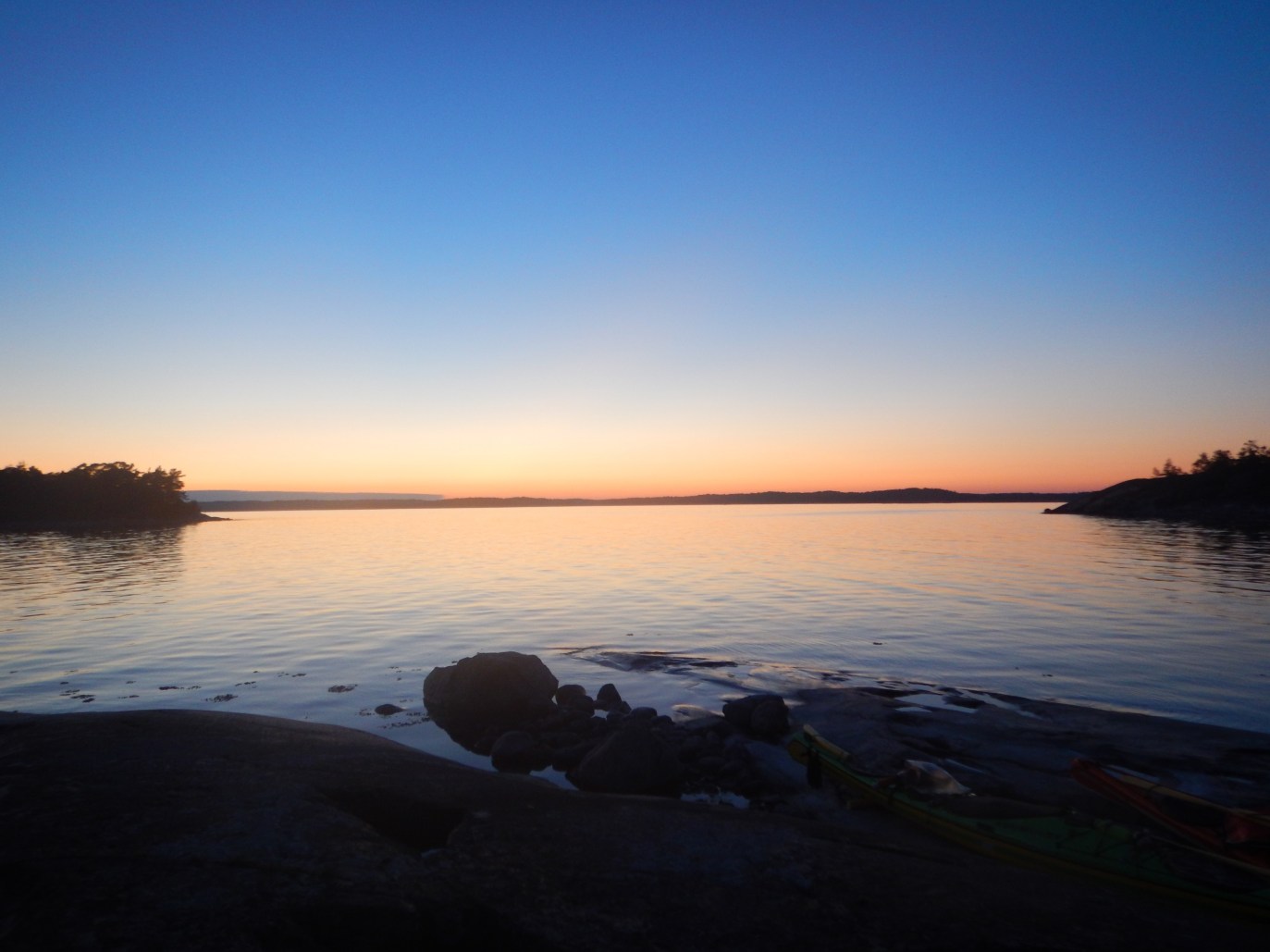 Kråkskär on retkisatama, jossa löytyy hyvänuotiopaikka ja puucee. Saaressa oli myös vanha talo jossa oli asuttu 50-luvulle asti. Kiertelimme saaressa ja ihailimme maisemaa, sitä lonkeronharmaata. No kyllä se hieman selkiytyi mutta vain hetkeksi. Istuimme iltaa nuotiolla ja turistiin katselle kuuta pitkään iltaan. Yö nukutti kyllä hyvin, päivä oli vaatinut energiaa aikalailla. Piti olla skarppina kokoajan ettei suunnista sivuun reitiltä.