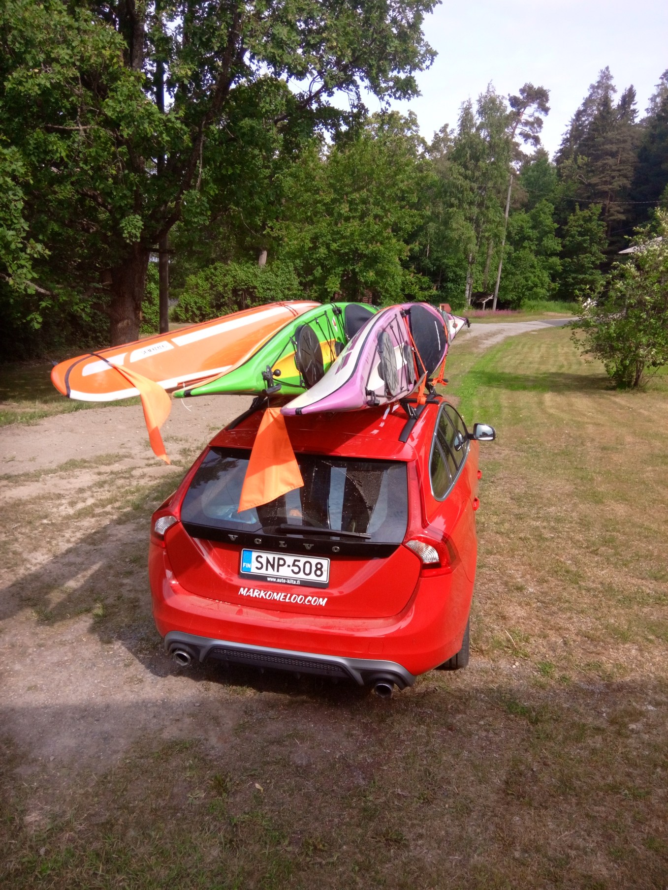 Tehtiin treffit Turkuun, josta sitten jatkoimme peräkanaa Paraisille pitsalle. Olimme tuon lättypaikan jo aiemmin katsastaneet Juhon kanssa, joten sikaa säkissä ei oltu tarjoamassa. Täällä lautanen löytyy pitsan reunojen alta, syötävää riittää näissä pitsoissa kyllä. Vatsat täynnä suuntasimme Paraisten Portille. Matka sinne on todella idyllinen pikkutie läpi saaristolaisen maalaismaiseman.Kajakkien pakkaus tapahtui kyllä aika rivakasti. Ilmeisesti kaikilla oli niin kova into päästä matkaan, että ei ollut aikaa haaveiluun. Rannassa vielä ensimmäisen etapin info ja varmistus, että kaikki on niin kuin suunniteltu ja sitten vaan vetoja.