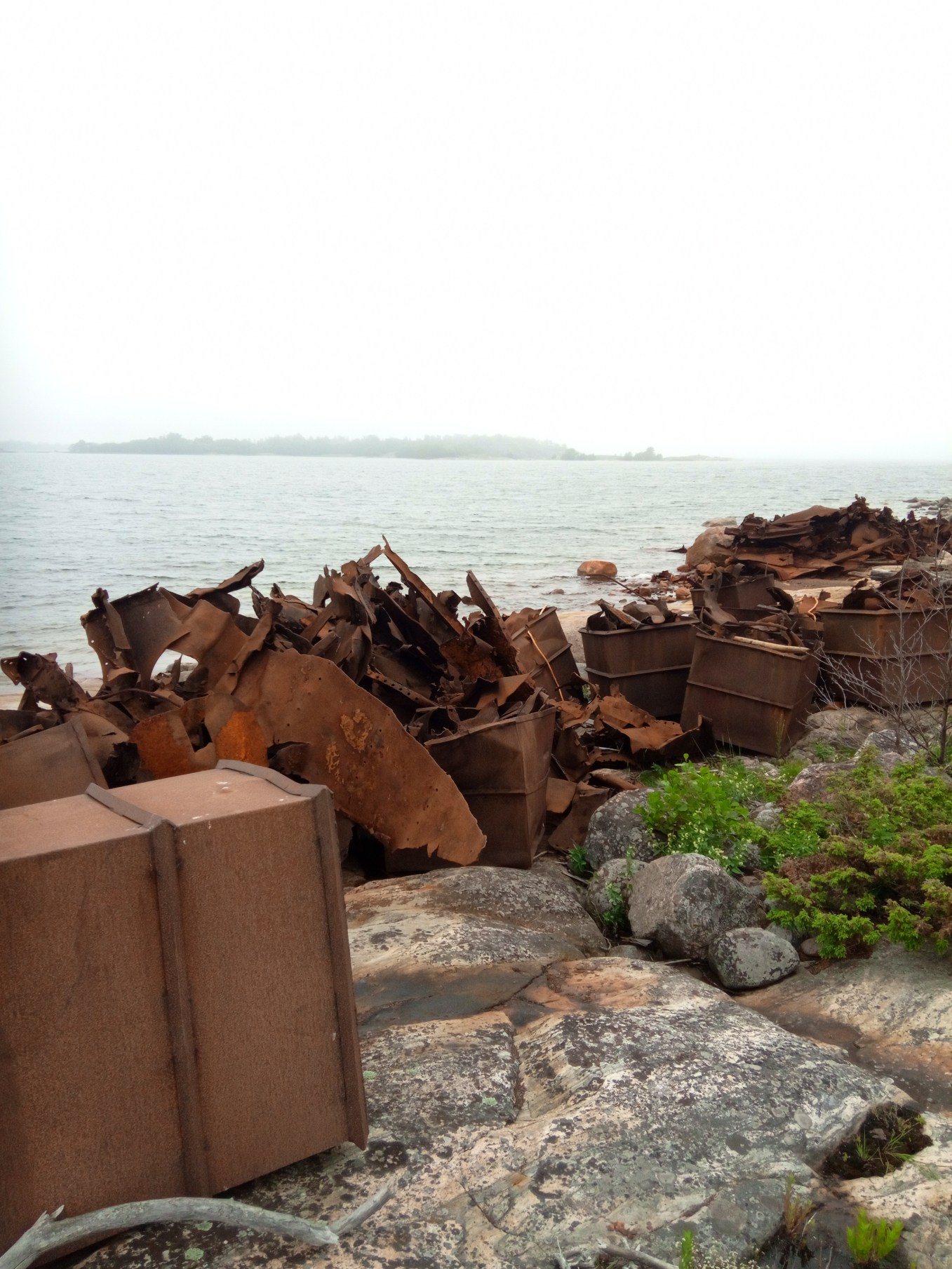 Ensimmäinen ylitys oli varmaan se kaikkein jännin – kukaan muu ei ollut sellaisessa sumussa melonut oudoilla vesillä. Aistin jo pientä epävarmuutta porukassa siitä, että osutaanko nyt oikeaan vai melotaanko ympyrää. Tietääköhän toi Marko nyt oikeasti mihin ollaan menossa? Kun aika oli kypsä niin sieltä sumun seasta alkoi erottua saari. Hei, täähän on helppoa kuin hengitys !! No seuraava sumumatka olisi pitempi, joten pienikin virhe kertaatuisi ja kun oli vielä hieman aallokkoa, joka sortaa suunnassa niin piti olla tarkkana ettei melota ohi. Maatauko olisi tulossa sitten seuraavaksi. Saadaan jännitystäkin hieman laukeamaan, kun hieman tepastelee saaren rannoilla. Näin edettiin saari kerrallaan kohti määränpäätä, missä tulisi olemaan lounastauko. Sumua ja aalokkoa, tämä yhdistelmä ei ollut ihan kaikkein mukavin yhdistelmä. On helpompi meloa kun näkee edes horisontin. Seuraan pysähdyksen nähtävyytenä olisi hylky, joka bongattiin muutama vuosi aiemmin Juhon kanssa. Sen kannella olisi mukava nauttia retkilounasta. Perille päästyämme huomattiin, että hylky oli palasteltu ja paikalla oli vain kasa ruostunutta rautaa. Perhana kun tuon olisi tiennyt olisin valinnut ihan toisen reitin ja muuta nähtävää. Nyt oli retkituolikin ihan turhaa mukana, tosin ei kyllä paistanut aurinkokaan. No nyt se oli myöhäistä surra asiaa.
