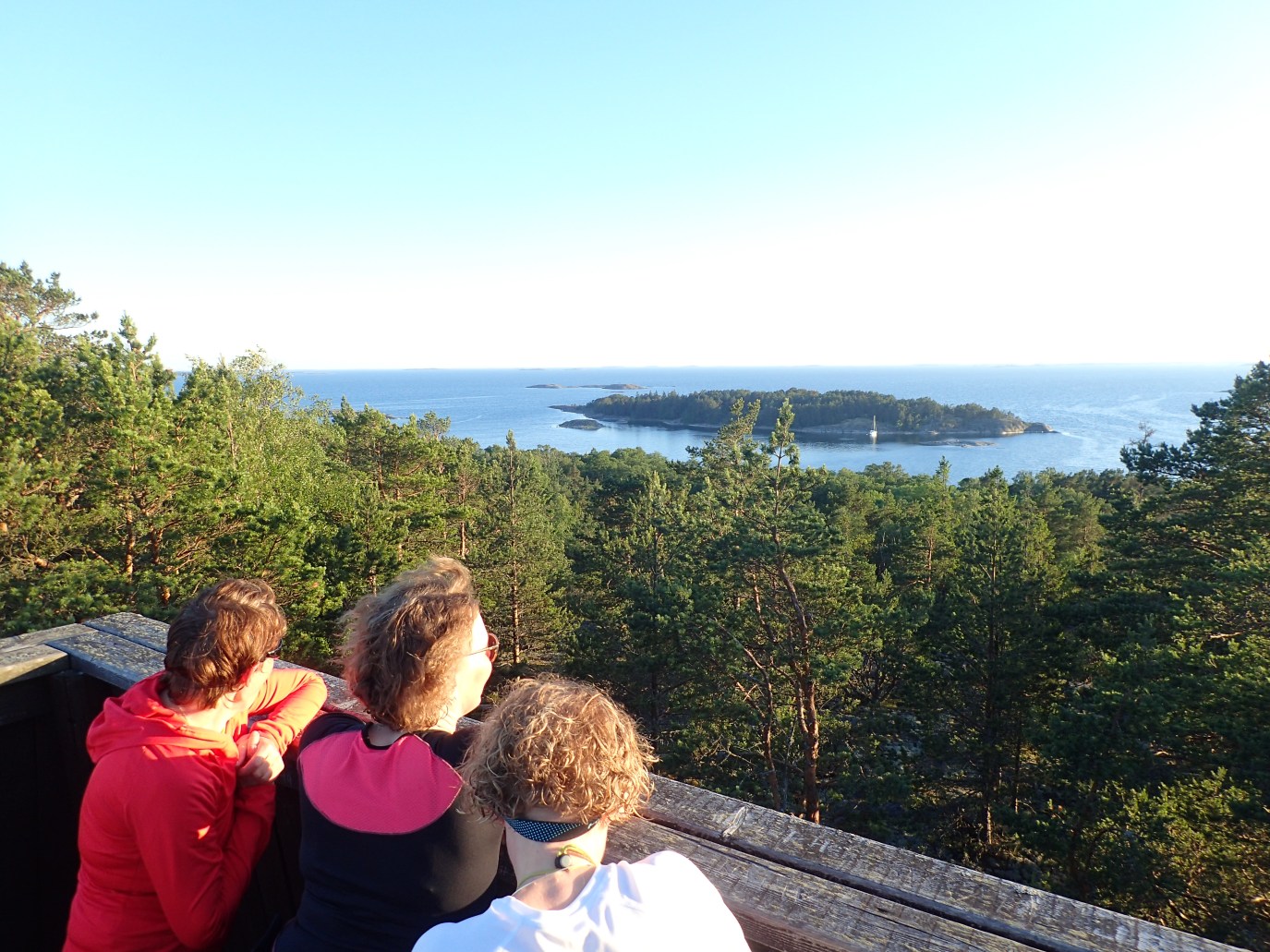 Leiri oli nopeasti pystyssä, ainakin osalla. Ei keritty kunnolla rantautumaan, kun osan teltat oli jo pystytetty. Me olla Juhon kanssa totuttu näin nopiaan touhuun, sillai rauhassa vaan. Saaressa kulkee luontopolku ja näköalatorni. Viimeksi rämmittiin oikoiseen vaan pusikon läpi. Polkua pitkin se olikin aika helppoa. Minut tuntevat tietävät, kun Marko oikaiseen niin hiki tulee. Näkymät tornilta on kyllä huikeat joka suuntaan.