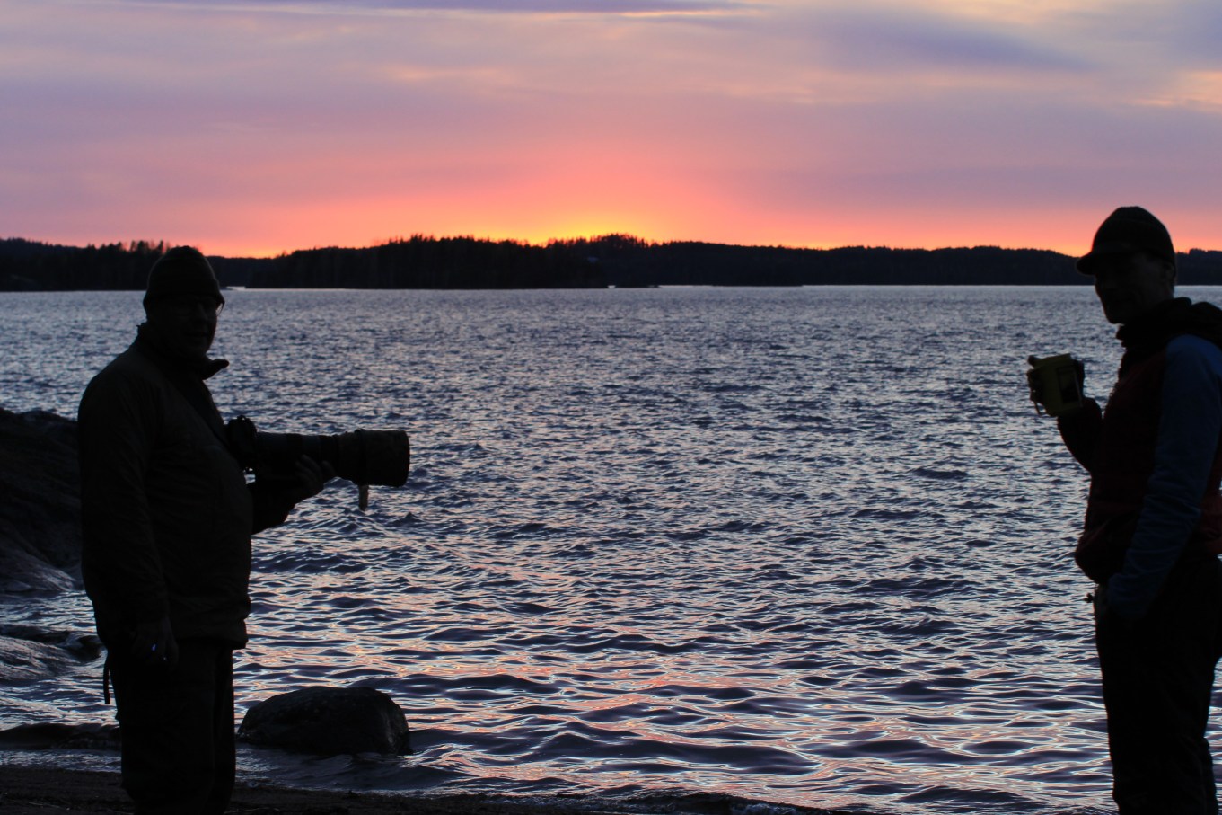 Kivisalmessa saatiin herra lähtökuntoon ja takaisin vesille. Keli olikin jo hieman laantunut mutta kyllä keliä silti tuntui riittävän. Noviisi vei meitä kokeneita mennen tullen, ainakin jos vertaa kajakin nopeuteen. Tätä vartenko tässä on monta vuotta harjoiteltu, että sitten sitä tullaan ja mennään kahdeksikkoa ympäri. Kajakkien nopeuksissa todellakin on eroja !!! Tuttu leiriranta otti meidät taas vastaan ja aivan upea auringonlasku hauskan illan päätteeksi.