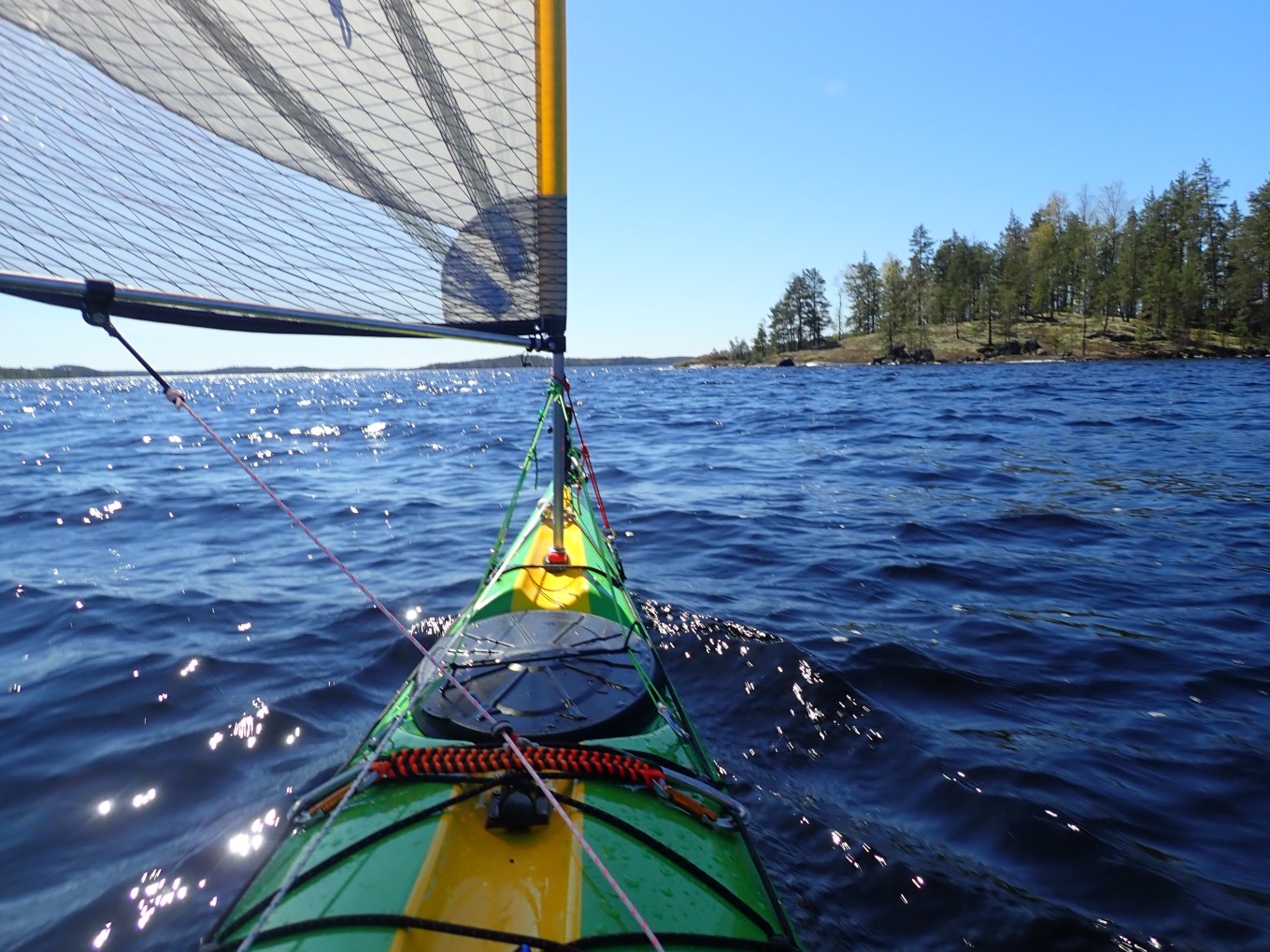 Maunolanselkä antoi pientä työntöä purjeeseen muuten niin tyynessä kelissä. Uittomonselkä oli tyyni ja pikkutauolle pysähdyttiin Soukanniemeen jossa oli myös laavu. Toki sitä ei ole merkitty mihinkään ja jäi epäselväksi onko se edelleen virallinen kohde vai ei. Sieltä suuntasimmekin sitten kohti, yllätys yllätys, Rokansaarta. Tällä etapilla vastaan tuli myös muita melojia. Hieman katsoivat pitkään meidän pukeutumista kuivapukuihin, heillä kun oli t-paidat. No niin kauanhan se menee hyvin kun ei kaadu tai joudu muuten ongelmiin. Vesi oli kuitenkin vielä vain hieman yli 10 asteista. Rokasaaressa sijoituimme vastakkaiselle puolen saarta kuin missä jo kaksi yötä olimme olleet.