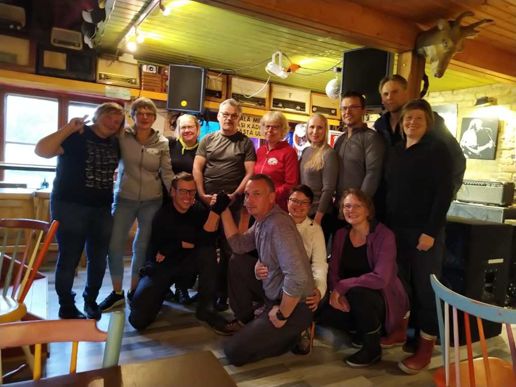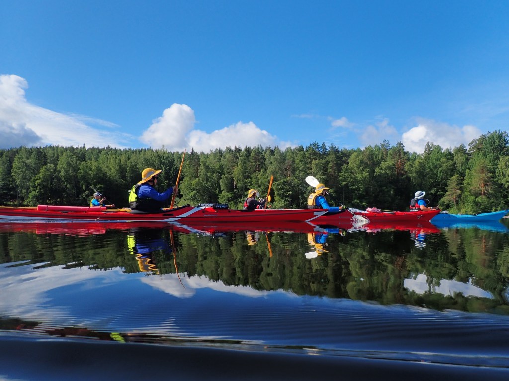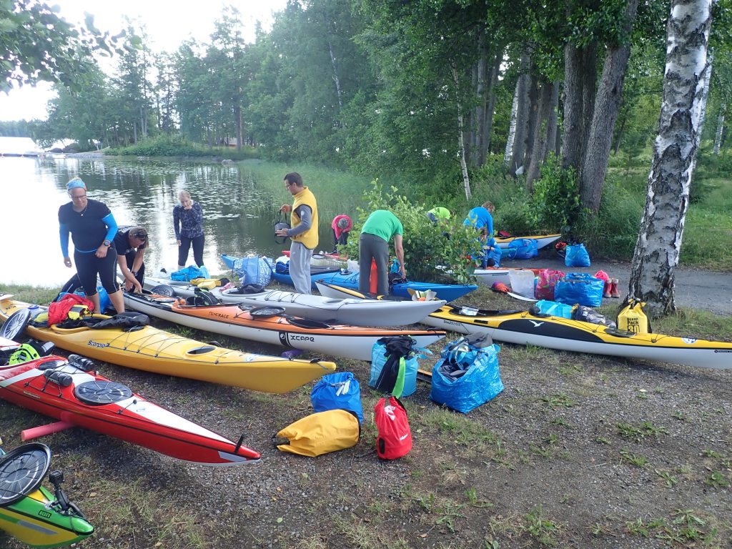 Pikkuhiljaa porukka valui kohti leiriä. Sateessa. Sunnuntai aamu valkeni aurinkoisena ja aamupalan jälkeen pakattiin märkiä telttoja kajakkeihin. Varusteet oli osakseen kuivuneet halkoliiterissä ja katoksessa. Saunassakin oli jotain mutta matkaan tavan mukaan, osa varttia ennen muita vesillä.
