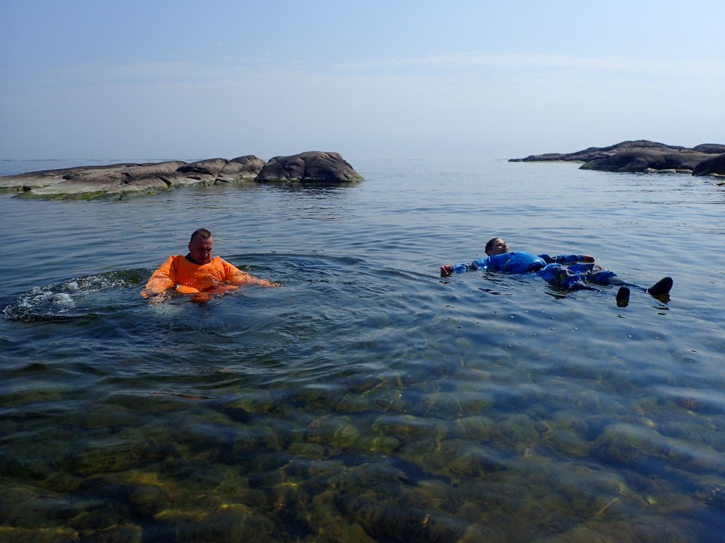 Aamusta lähdimme ylittämään isompaa selkää (Kvigharu fjärden) kohti seuraa telttailusaarta. Melomiseksi meni kun oli aivan tyyntä mutta lämmin ilma. Tiesimme seuraavan saaren lähellä hylkeiden lekottelukivet ja tarkoitus olikin päästä kuvaamaan niitä. Onni oli myöten ja siellähän oli useampikin köllöttelijä auringossa. Juholla oli pitkä putki matkassa joten lähikuvaa saatiin aika mukavasti aikaiseksi. Peten dronella saatiin hyvää yleiskuvaa. Uimassa tuli käytyä kuivapuku päällä ja ilmankin melkein – paitsi Juho joka molskautti veteen kuin vanha tekijä.