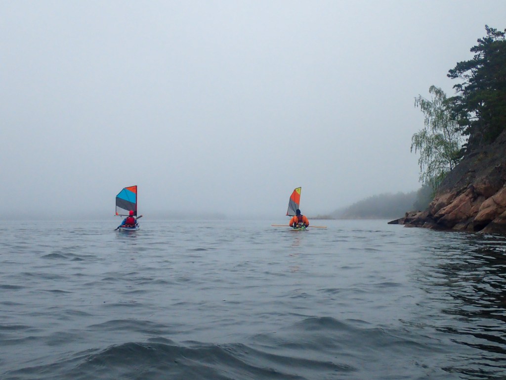 Jurmon päässä pakattiin kajakit nopeasti, jotta päästään vesille ennen kuin tuuli alkaa tyyntymään. Luvassa olisi lähes myötätuulta, loistava sää purjemelontaan. Matka sujui yllättävän nopeasti ja tuulta riitti leirisaarelle asti. Paikka on Metsähallituksen virallisia telttailusaaria. Kaunis ja jylhä paikka. Kaikki ympäröivät saaret on suojeltuja joten luonto on kaunista ja rikasta. Väyliäkään ei mene lähellä. Nappipaikka meille erakoille. Siirsimme leirin vielä tyynelle puolelle kun tuuli tuntui puhkuvan pitkälle iltaan. Eikä se ollut kovin lämmin vaikka ilma muuten oli t-paita keliä. Juho ja minä ollaan oltu täällä jo ennenkin mutta Petelle se oli uusi paikka.